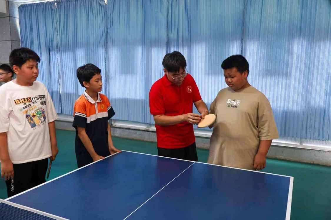乒乓球課上,實(shí)踐團(tuán)成員認(rèn)真負(fù)責(zé),耐心教學(xué),從握拍及徒手揮拍講起,扎實(shí)學(xué)生基本功,培養(yǎng)手感、了解球性、規(guī)范擊球動作。在面對面交流互動中,激發(fā)他們對乒乓球的興趣和熱愛。