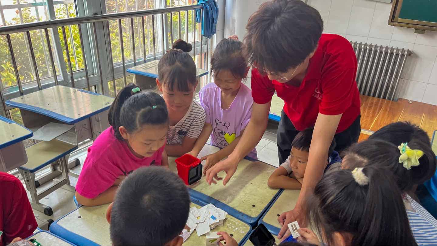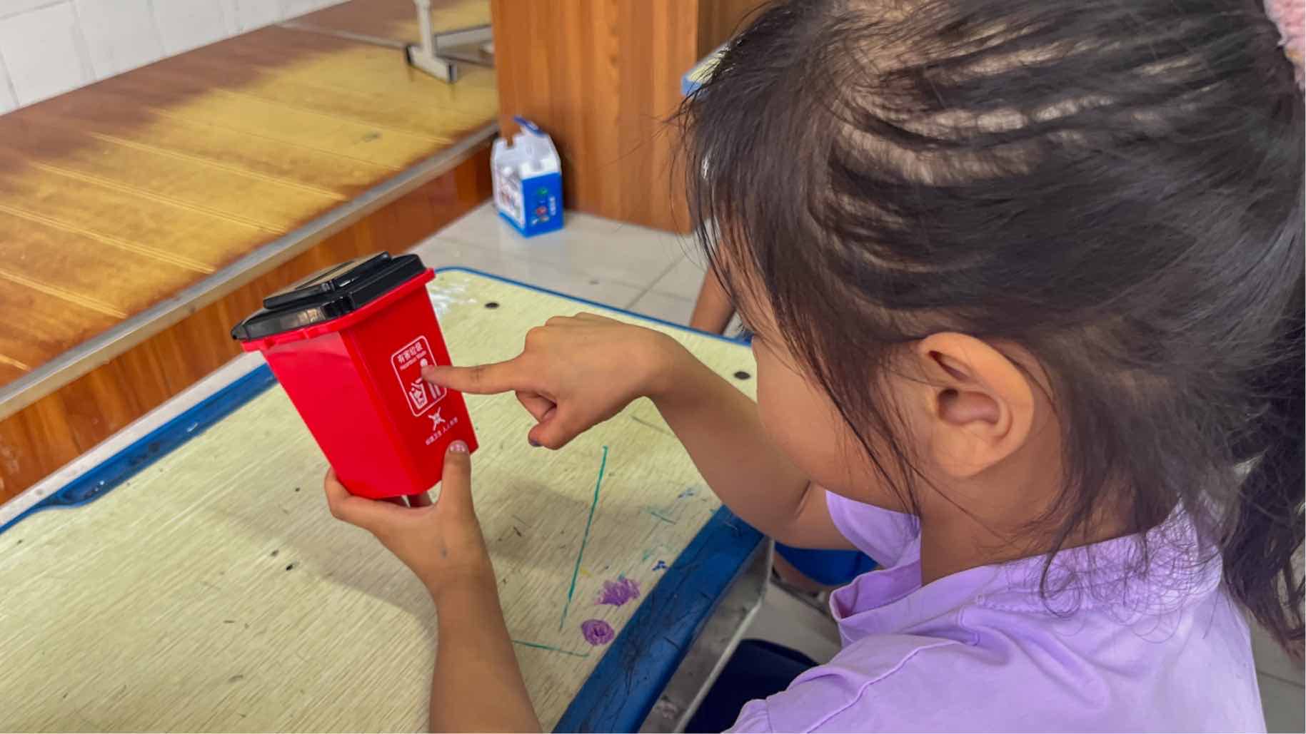 ,楊召珍精心設計數張代表不同類型垃圾的小卡片,通過開展“尋找垃圾桶”的趣味游戲,將班里學生分為兩組,每組都有著不同類型的垃圾卡片,學生卡片放入對應的垃圾桶內,模擬垃圾驛站進行垃圾分類。