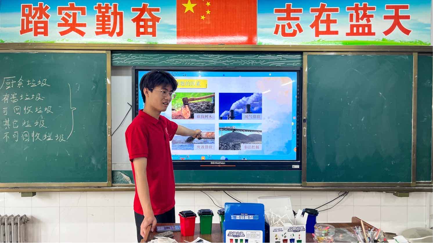 在普及垃圾分類課堂上,實踐團成員楊召珍向學生講解垃圾分類知識并通過生動直觀的圖片以及實際案例詳細講解“如何進行垃圾分類以及怎么分類”和“分類后如何處理”等相關問題,引導學生分辨出“可回收物”和“不可回收物”及相應垃圾桶,進一步提高學生生活垃圾分類意識;同時楊召珍以寓教于樂的方式與學生進行互動問答,學生積極互動,面對一系列有關垃圾分類的問題,他們不僅踴躍舉手而且對答如流,展現出了對環境保護濃厚的興趣和良好的認知,此外楊召珍呼吁學生參與到垃圾分類中去,鼓勵學生將自己廢舊物品收集至垃圾回收驛站,引導學生樹立綠色回收理念。