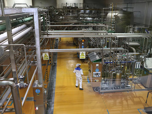 走到展廳的另一側,透過透明玻璃墻,調研隊員們得以一睹各車間的真容并感受工廠自動化和機械化的程度。一根根縱橫交錯的管子運輸著新鮮的奶源,一個個大大小小的罐子存儲著醇香的牛奶。在不同的車間內,大家可以看到工作人員們忙碌的身影。在常溫車間,工作人員操作儀器對新鮮的奶源進行著各種初步的處理;在高溫車間,牛奶在快速流過管道的同時被高溫瞬時滅菌,隨后輸送到下一個工序;在后包裝區域,企業在近年來已經越來越朝著自動化的方向發展,所以不同于大家印象中的人山人海,在空曠的區域只看見幾個工作人員在勤懇工作。由此可見工廠自動化和機械化程度之高。相關技術人員還強調,從擠奶開始到牛奶送達大家手里的過程中員工都沒有直接接觸過牛奶,整個生產過程是在適溫無菌環境下操作的,這樣做是為了避免牛奶被污染,從而保證牛奶的品質。