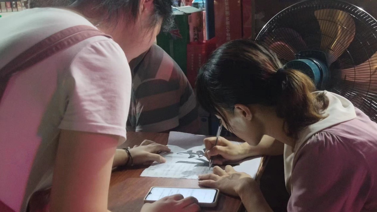 圖為實踐隊員在采訪后居民書寫二十大有關句子。