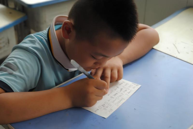 在比賽過程中,同學們奮筆疾書,以工整規范的書寫進行單詞默寫。無嘩戰士銜枚勇,下筆春蠶食葉聲,活動現場的沙沙聲,是孩子們積極準備努力學習的落地聲,是老師們對同學們殷殷的教導聲,是孩子們成長路上的一桿旗幟鼓鼓的舞動聲。整個過程組織嚴密,科學規范,孩子們熱情高漲、神情專注,做到了“耳到、眼到、心到、手到”,卷面字跡流暢端正,整潔漂亮,展示了扎實的英語書寫功底和單詞功底。隨著時間的推進,比賽逐漸落下帷幕。