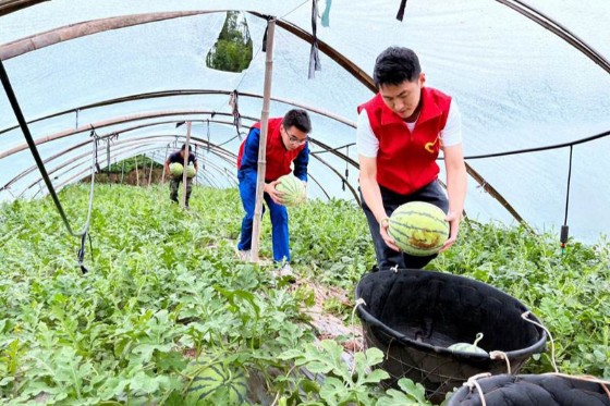 圖為實踐隊隊員在瓜棚幫助瓜農一起采摘西瓜 愛開大學生網通訊員 梁悅悅 供圖