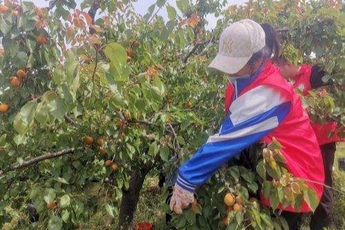 圖為實踐隊隊員在杏子林采摘杏子 愛開大學生網通訊員 梁悅悅 供圖