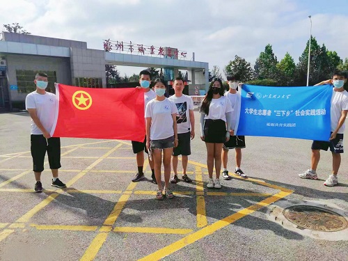 圖為實(shí)踐團(tuán)成員與負(fù)責(zé)人孫元棟在膠州市職業(yè)教育中心門(mén)口合影 陳艷姿 供圖