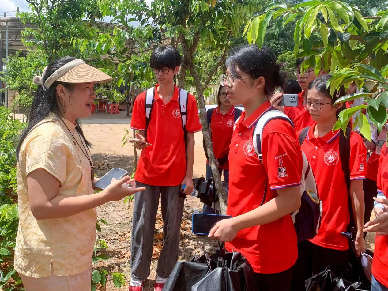 圖為種植園負責人朱嘉麗向實踐團介紹黑油霸母樹 通訊員李貞瑩供圖