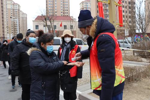 各檢測點在接到核酸篩查命令后,連夜組織工作人員進行各項準備工作,“紅馬甲”也成為寒冬抗疫溫暖人心的力量,志愿者們有序組織排隊人群,積極維護排隊秩序,使整個采樣過程既流暢又高效。第二輪篩查仍然以樓棟為單位,一名工作人員帶領一位志愿者按照排隊的進度、挨家挨戶通知村民下樓檢測,全力實現“村民等候時間最短,檢測現場排隊人數最少”。村民下樓后,由帶隊志愿者劃分為10人一組,全程跟隨至信息核對登記處,抗疫小隊隊員在現場擔任登記的工作同時,抗疫小隊隊員在檢測點隊伍旁維持著秩序,不斷提醒村民帶好口罩、攜帶身份證、站“紅線”(間隔距離一米)。保障現場秩序井然、不聚集、不混亂,也提高了大篩的工作效率。