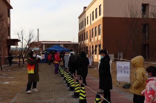 抗疫小隊隊員在檢測點隊伍旁維持著秩序。整個過程人們都很積極,聽從指揮,按照地上紅色的油漆標志間隔一米,嚴格遵守全程佩戴口罩,徐徐前進。為村民進行采樣的醫務人員為了村民們能少在寒風中等待,兩名醫務人員共同上陣,開通兩條采樣通道,極大地加快了篩查的速度。“大冷天的,排隊時間能再縮短點嗎?”“這招兒行啊,咱拿著身份證就行,嘛都不用掃,他掃咱們。”“好么,隊伍一直在動,介我還帶了小板凳呢,照介意思,一會兒就能回家了!”在排隊的人群中,大家探出頭確認前方情況,不時發出這樣的感嘆。
