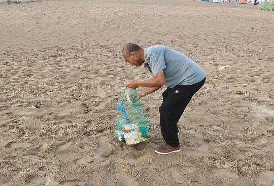圖為某游客在實踐隊員的宣傳下收拾旅游垃圾 匯民力:勠力同心助力村莊風貌改善人不負青山,青山定不負人。在進行海洋生態環境保護知識的宣傳后,實踐團成員便投入到了當地海岸環境整治的隊伍當中。當天,成員們帶領漁村村民進行了“凈灘活動”,旨在清理海岸垃圾,還美麗海岸線以原貌。隊員們與當地保潔人員合作,獲得了網袋、手套若干。當地村民在實踐隊員的號召下也積極主動參加活動,炎炎烈日下,每個人都沒有喊苦喊累,而是全心全意投入到垃圾清理的工作當中。一些村民表示,之前從來沒有意識到海灘已經被污染得如此嚴重,大家仿佛都已經司空見慣了,是這次活動使大家意識到保護海灘已刻不容緩。最終隊員與村民們合力撿了15斤海洋垃圾,包括舊衣服、礦泉水瓶、塑料袋、塑料桌布等。