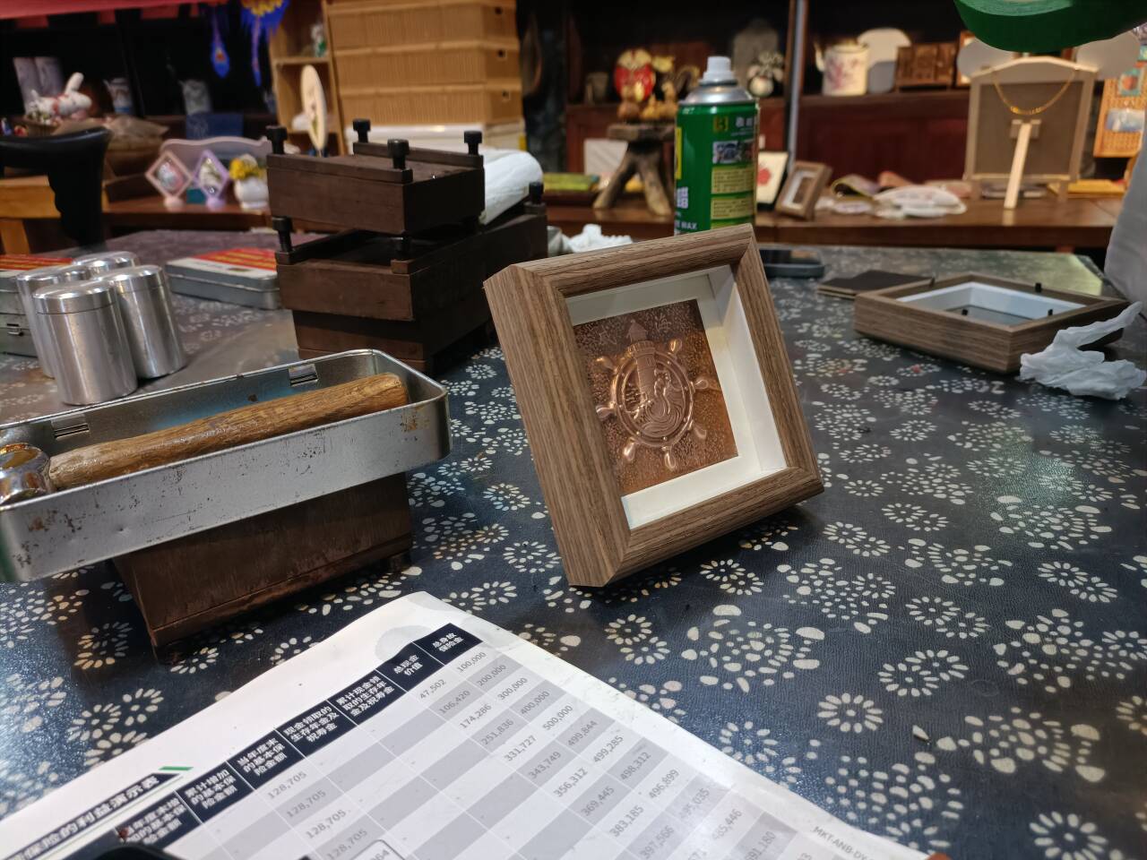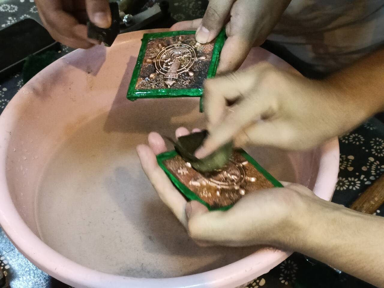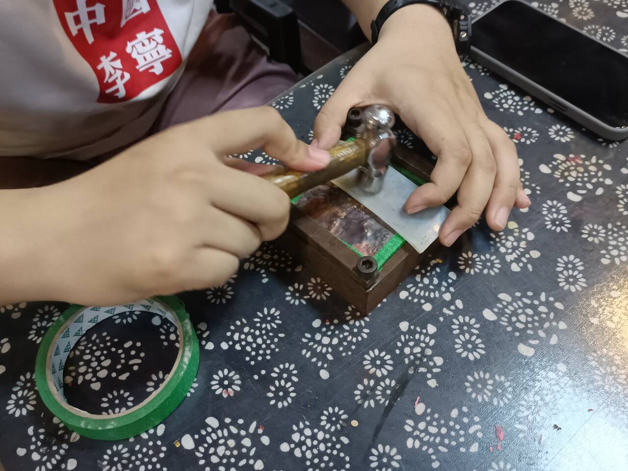 圖為團隊成員在敲打銅板,進行制作