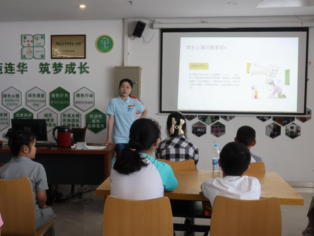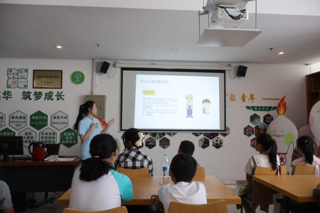 在當今社會,孩子們在學習、生活和社交方面都承受著不小的壓力。為此服務隊成員但欣玥為孩子們帶來了一堂富有意義的心理健康教育課。該課程從“什么是心理健康”“孩子們的困惑”“學生心理問題展現”“同學們該做些什么”四個方面展開。