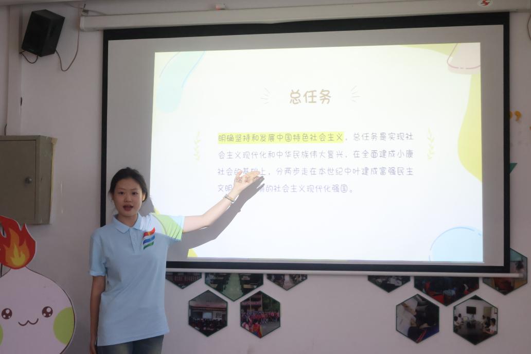 開班第一課,服務隊成員趙靈為孩子們開展了一堂習近平新時代中國特色社會主義主題教育宣講。課堂內容從新時代中國特色社會主義思想的“總任務”“發展布局”“經濟制度”等方面進行講述。結合學生的身心特點,緊扣當地民族特色,通過故事分享、視頻分析和互動提問,對新時代中國特色社會主義思想的總體概述、思想內容、基本方略進行了系統的講解。孩子們認真聆聽,踴躍回答問題,課堂氛圍十分熱鬧。