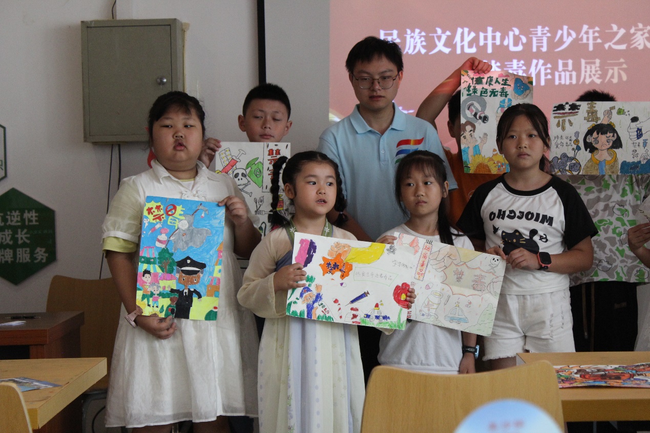 圖為青年之家小朋友們展示自己的禁毒主題繪畫作品 但欣玥 供圖