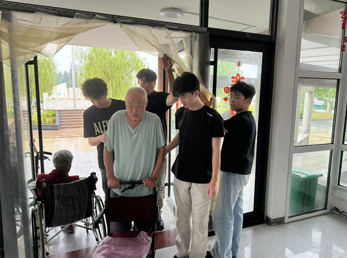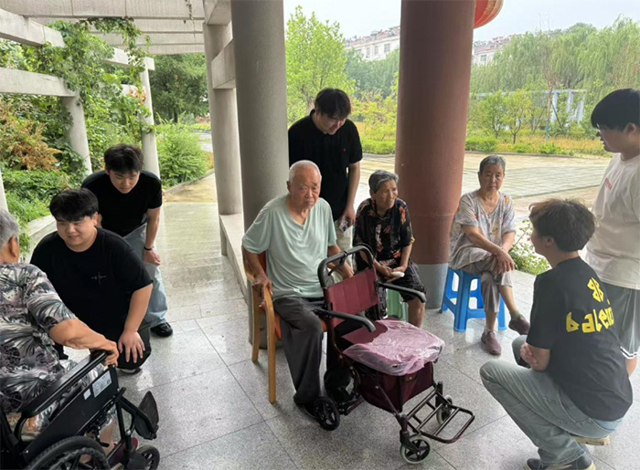 實踐期間,每天的清晨和午后,實踐團成員都會陪伴老人們散步、乘涼,或幫助他們出入活動區域。有位腿腳不便的老人在學生協助下,緩緩走出門口,坐在走廊下的長椅上。雨后的空氣清新濕潤,幾位老人圍坐交談,幾位青年志愿者則蹲在一旁認真傾聽,偶爾插入幾句,氣氛溫和融洽。成員們不僅為老人撐傘遮雨,還細心攙扶,確保每一位長者在活動中的安全與舒適。