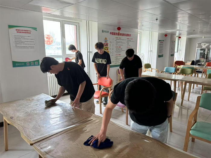 步入老人活動室,青年志愿者們手持抹布,分工協作,正有條不紊地擦拭桌椅和窗臺。室內燈光灑落在他們彎腰忙碌的身影上,也映出他們對勞動的認真與負責。這是實踐活動的首日,成員們以清潔衛生為起點,為老年人營造整潔舒適的居住環境,也為接下來的陪伴服務打下基礎。