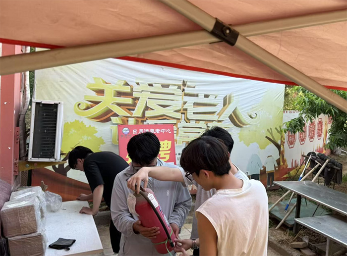 在另一處活動(dòng)點(diǎn),幾位成員圍在一具干粉滅火器旁,認(rèn)真學(xué)習(xí)如何檢查滅火器壓力值、是否過(guò)期及噴嘴是否暢通。他們還在工作人員指導(dǎo)下進(jìn)行簡(jiǎn)單操作演練,為養(yǎng)老中心消防安全出一份力。