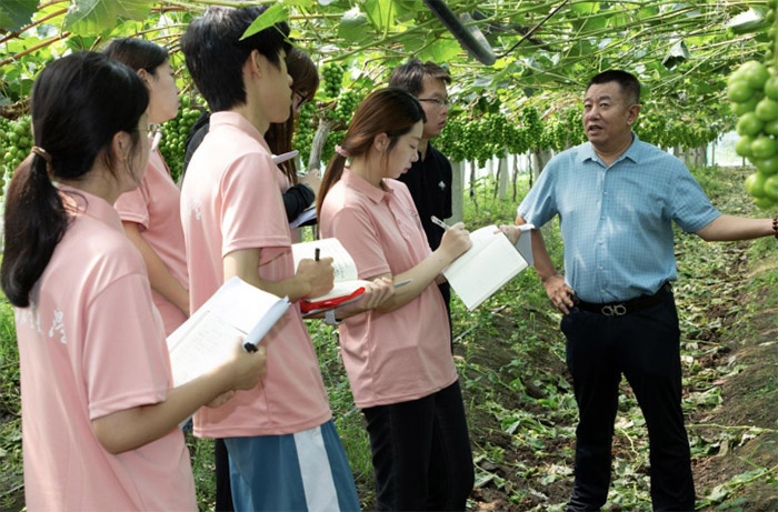 7月15日,實踐隊員前往平度市青島高氏葡萄種植莊園有限公司、山東省鮮食葡萄研究所社會實踐,探尋規模化經營賦能葡萄產業提質增效的發展路徑。高氏莊園構建“公司+合作社+種植戶”模式,積極為葡萄種植戶提供種植技術、銷售渠道、農資采購等服務,從產業生態構建、生產管理創新、市場渠道拓展,到文化傳承與合作社協同,多維度探索葡萄產業融合發展路徑。山東省鮮食葡萄研究所積極參加全球性的葡萄產業論壇,為推動葡萄“種得好”邁向“賣得好”“賣得遠”,實現葡萄產業品牌價值提升,積極打造具有地域特色的產業名片,為鄉村振興奏響共富發展的新樂章。
