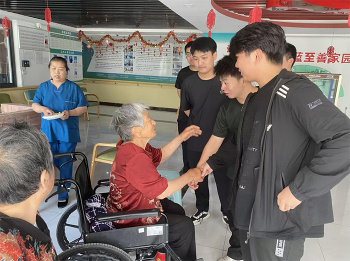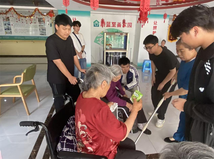 有趣的是,一名實踐團成員蹲下與老人面對面交談時,老人用雙手握住了他的手,久久不愿松開。這一幕也感染了周圍的同伴,紛紛加入其中,圍繞著老人展開溫馨對話。過程中有位護理員輕聲提醒老人按時服藥,成員們也默契配合遞上水杯,配合照護工作的細致度不亞于專業人員。