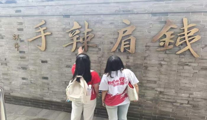 圖8團隊成員于磚墻前感受“鐵肩辣手”精神