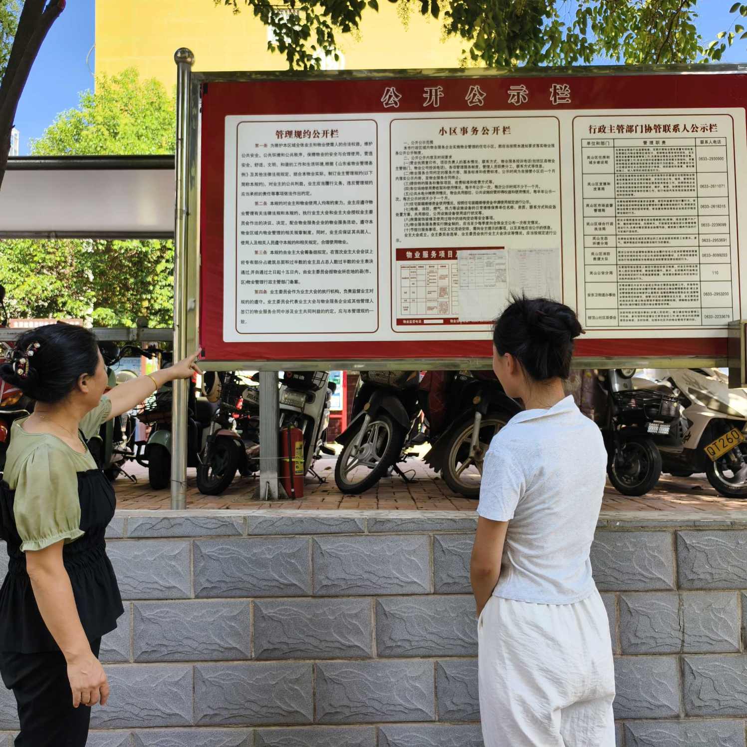 圖2 日照市嵐山區阿掖山花園社區干部向隊員介紹公示欄情況