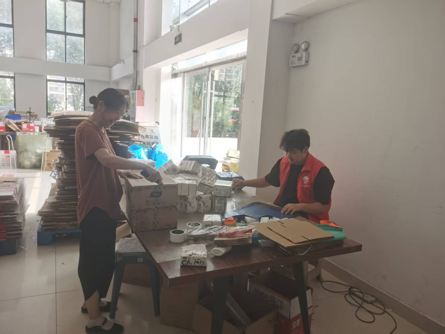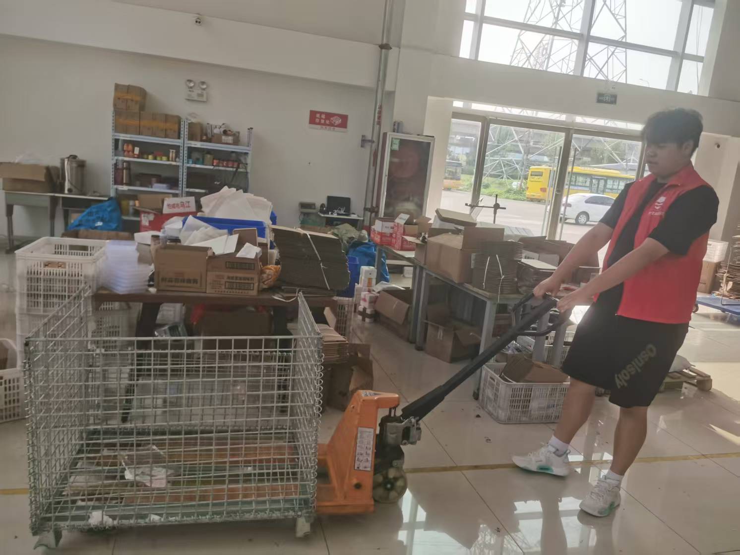 圖為實踐員趙天軼處理退貨 與物流配送進行溝通對接,及時將打包完成的訂單移動至配送環節,確保貨物按時送達客戶手中。
