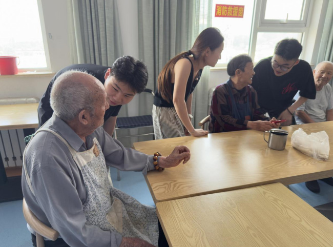 在養老中心的公共活動室內,實踐團成員與老人們促膝交談,認真傾聽他們的生活故事和心聲,現場氣氛溫馨融洽。年輕人與長者之間的互動讓原本安靜的房間充滿了笑聲和溫情,老人們的臉上也逐漸露出舒心的笑容。