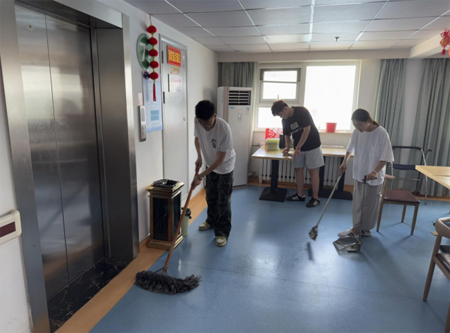 除精神陪伴外,實踐團成員還積極投入到實際勞動中。他們走進老人們的房間,細心為臥室整理床鋪,疊放整齊的被褥使居住環境更加舒適整潔。與此同時,另一部分成員拿起清潔工具,對走廊和活動區域進行全面打掃,確保環境干凈明亮,為老人們創造出一個更加舒心的生活空間。