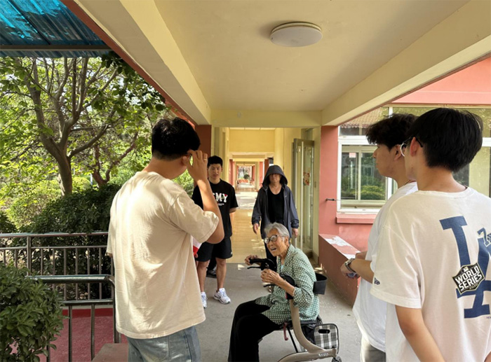 在服務的空閑時段,實踐團成員們還積極與養老中心的老人們進行面對面交流。走廊中,一位坐在輪椅上的老人正與幾位年輕人交談,臉上洋溢著愉悅的笑容。成員們認真聆聽她的講述,時而點頭回應,時而耐心詢問日常生活細節,用實際行動陪伴老人的精神世界。