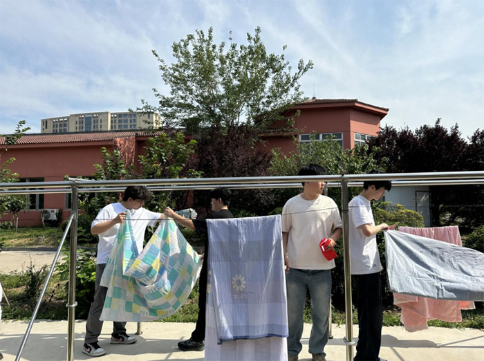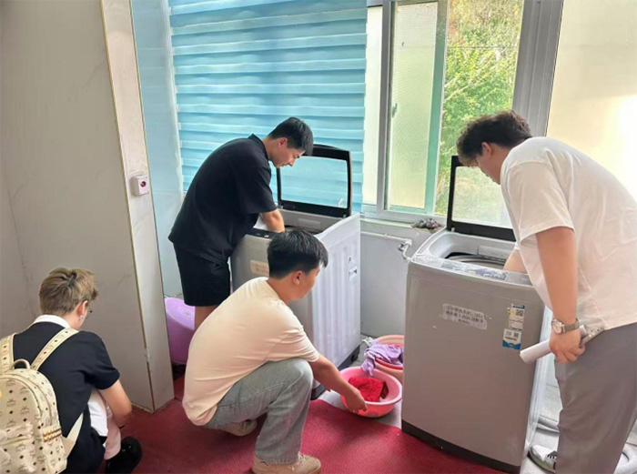 除了戶外工作,實踐團成員還主動參與室內洗衣服務。老人們的衣物由成員們分批清洗、晾曬,有序放置在專屬標記區域。他們仔細分揀衣物、調試洗衣機程序,并在等待洗滌的過程中仔細觀察洗衣流程是否順利。部分成員蹲在地上,協助將洗凈的衣物擰干、整理,整個過程高效而有條不紊。