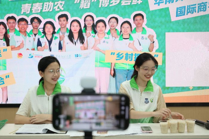 直播現場,實踐團成員化身 “新農人主播”,以 “一粒米的蛻變” 為主線,從晶瑩剔透的生米展示到熱氣騰騰的熟飯品鑒,“米粒修長如絲,蒸煮后油潤透亮,口感軟糯回甘”,隊員們結合承糧陂村綠色種植的獨特優勢,將產品特性轉化為可視化體驗,全方位呈現香絲苗米的優質品質,引得屏幕前的觀眾紛紛留言,“看餓了”“馬上下單”。
