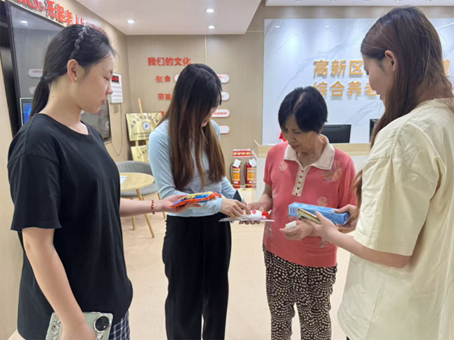 在物品分發環節,幾名成員將精心準備的生活用品逐一遞到老人手中,包括牙膏、紙巾、餅干等日常必需品。老人臉上洋溢著滿意的笑容,不斷向孩子們道謝。而實踐團成員則耐心說明每件物品的使用方法,確保她們真正理解和用好。