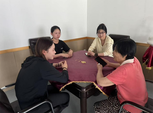 在服務中心的一間活動室內,實踐團成員圍坐在長者身邊,傾聽她講述年輕時的往事,耐心回應她提出的每一個問題。五名青年成員全神貫注地與老人交流,氣氛溫暖融洽。老人時而微笑,時而動情,在輕松愉快的談話中建立起了深厚的信任感。此次交流不僅拉近了代際之間的心理距離,也為老人帶來久違的精神慰藉。