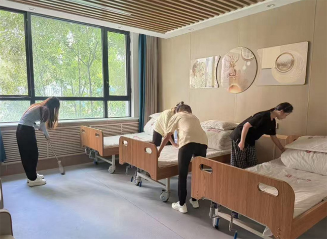 除了陪伴聊天,實踐團還積極投入到護理區域的衛生整理工作中。在病房內,成員們分工合作,有的認真打掃地面,有的細致整理床鋪,有的檢查生活用品的整潔度,確保每一張床位都干凈舒適。她們的行動雖默默無聲,卻有力詮釋著對老年人的尊重與關懷。