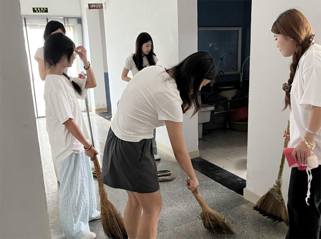 除了日常陪伴,實踐團成員還主動承擔起清潔任務。在走廊內,他們手持掃帚細致打掃地面,確保環境整潔衛生。老人們安靜地休息,青年們則默契配合,分工明確,讓養老中心的環境更加舒適宜人。