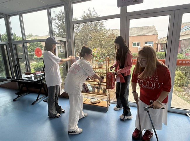 除了日常陪伴,實踐團還積極參與院內環境整理工作。在書屋區域,志愿者們分工協作,有的擦拭書架,有的整理圖書,有的打掃地面,將空間收拾得整潔有序。窗外陽光透過玻璃灑進來,映照著他們忙碌的身影,也讓整個活動室煥發出新的活力。