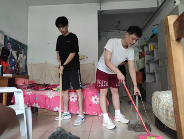 實踐團成員拿起衛生工具,仔細清掃房間地面與角落,經過一番努力,原本陳舊的環境煥然一新,老人們居住的空間變得更加整潔舒適。