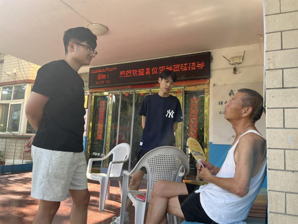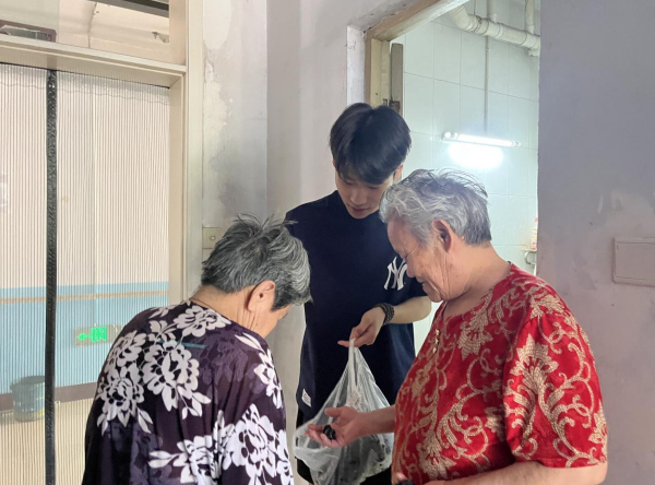 除了體力上的幫助,實踐團成員還通過與老人交流,傾聽他們講述過往生活,主動關心他們的飲食和生活細節。在一間廚房門口,一名青年正向兩位老人遞送分裝好的水果,三人面帶笑容,交流熱絡。這些細節體現了實踐團成員對老人的尊重與關愛。