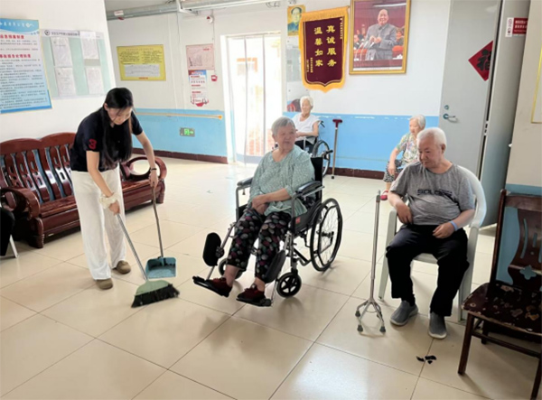 與此同時,室內環境的整潔也成為實踐內容的重要一環。成員們手持掃帚、撮箕,在老人休息期間有序打掃公共區域。即便是在簡單的勞動中,學生們也始終保持認真細致的態度,力求為老人營造一個干凈、舒適的生活環境。老人們看到年輕人主動服務,紛紛表示欣慰。
