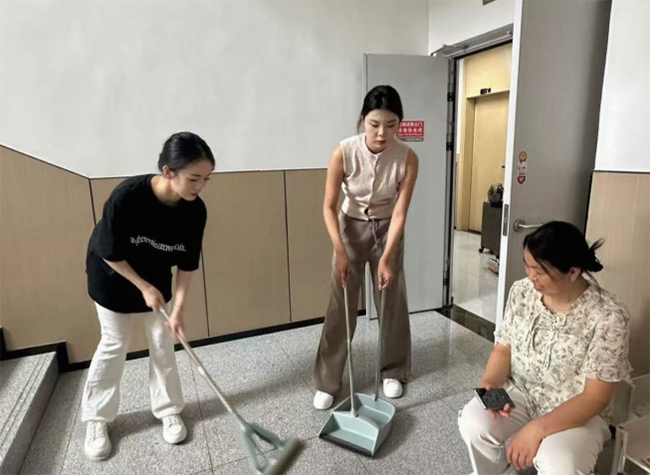 在日常服務中,實踐團成員主動承擔起清潔任務,有的拿起掃帚和簸箕認真打掃走廊,有的幫助護理人員減輕工作負擔,確保老人們居住的環境整潔舒適。與此同時,他們還細心地為工作人員按摩肩頸,表達對長期辛勤付出的理解與關心。
