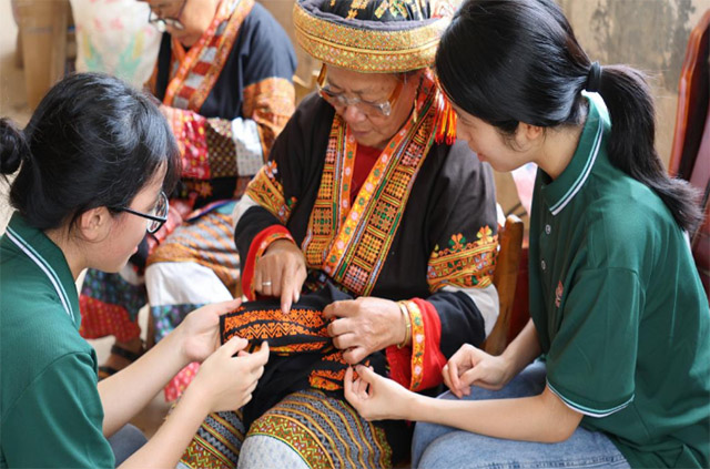 圖為瑤族繡娘為團(tuán)隊(duì)成員講解瑤族紋樣。張君供圖