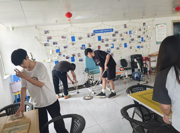 在接下來的幾天中,實踐團(tuán)成員主動承擔(dān)起院內(nèi)日常衛(wèi)生清潔工作。男生負(fù)責(zé)擦拭走廊玻璃和整理老人活動區(qū)的桌椅,女生則細(xì)致地為每一張桌面消毒清潔。特別是在健身康復(fù)區(qū),幾位成員輪流拖地、擺放器械,確保老人鍛煉時環(huán)境整潔安全。值得一提的是,實踐團(tuán)還為老人們精心布置了“照片墻”,將活動現(xiàn)場的合影打印并懸掛,許多老人站在墻前久久觀望,臉上滿是笑意。