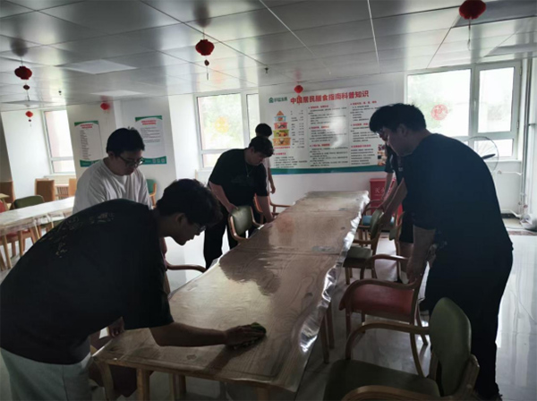 圖為“青春無限速”實踐團(tuán)成員為老人就餐環(huán)境進(jìn)行清理