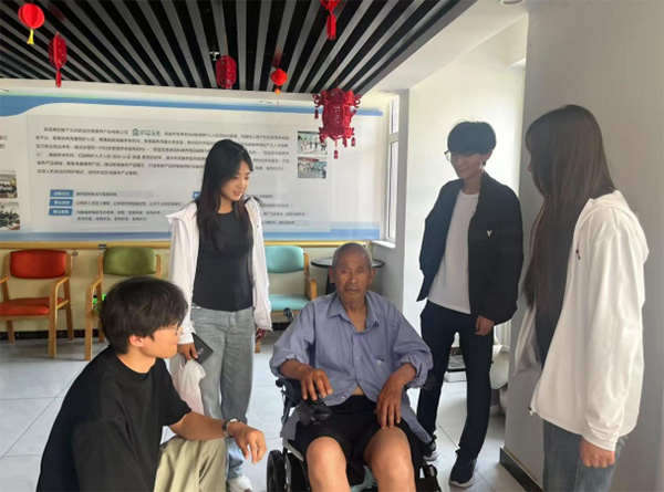 在養(yǎng)老院的公共活動(dòng)區(qū),幾名實(shí)踐團(tuán)成員圍坐在一位老人身旁,耐心傾聽他的生活經(jīng)歷與日常需求,輕松的交談氛圍拉近了志愿者與老年人之間的距離。這一場景不僅讓老人感受到陪伴與關(guān)懷,也讓實(shí)踐團(tuán)成員更加直觀地理解了老年人的心理需求。