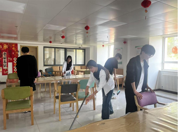 在完成走訪陪伴的同時(shí),實(shí)踐團(tuán)成員還投入到環(huán)境整理中。大家分工協(xié)作,有的搬動(dòng)桌椅,有的清理地面,有的擦拭桌面,確保公共空間干凈整潔。整齊的環(huán)境為老人們提供了更加舒適的休息和交流場所。