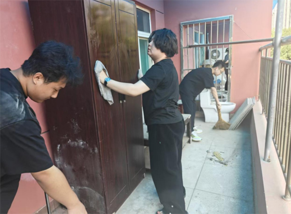 圖為“小紅花”實踐團成員清理室內衛生死角