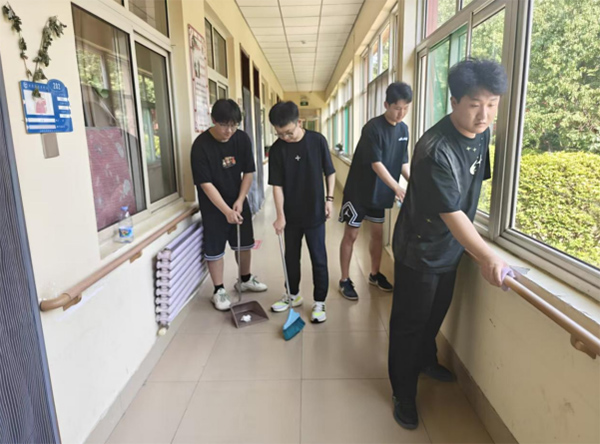 除交流陪伴外,實踐團還積極參與到環境整治中。志愿者們手持抹布和掃帚,對走廊、房間和公共區域進行清理,確保環境整潔舒適。在陽臺上,有的同學擦拭柜子,有的清掃地面,分工明確、配合默契。室內的窗臺與扶手也經過細致擦拭,使得整個養老中心煥然一新。