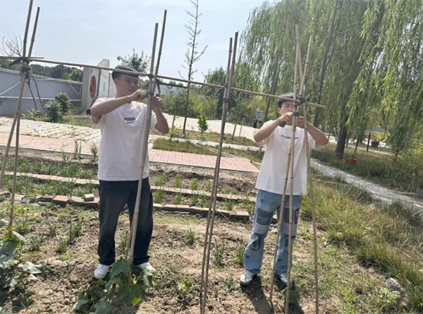 在敬老院的庭院里,實踐團成員搭建起竹竿支架,為蔬菜藤蔓提供穩固的依托。頂著烈日,他們認真固定每一根竹竿,確保菜地里的植物能夠健康生長。這不僅是對勞動技能的鍛煉,更展現了對老人日常飲食保障的用心。