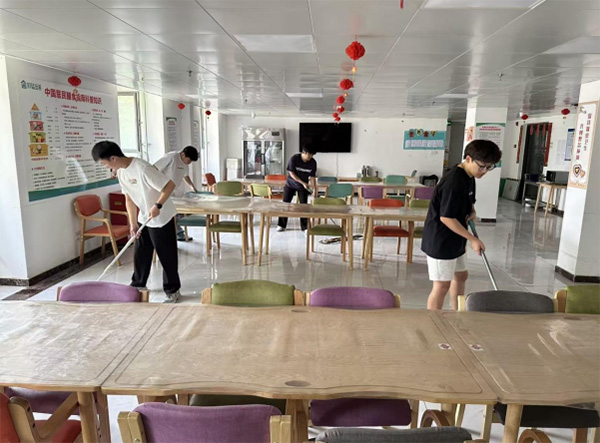 室內的實踐同樣忙碌有序。餐廳內,幾名成員分工協作,拿著拖把和抹布,對地面和桌椅進行仔細清潔。每一塊瓷磚都被擦拭得干凈明亮,整齊的環境讓敬老院的用餐氛圍更加舒適溫馨。與此同時,另一部分成員走到老人身邊,輕聲問候,細心聆聽長者的生活點滴。面對老人親切的叮嚀與訴說,團員們以真誠交流回應,場面溫暖動人。