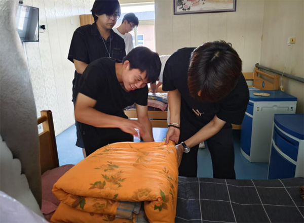 在生活服務方面,成員們走進老人房間,主動幫助整理床鋪,折疊被褥。面對厚重的棉被,志愿者們配合默契,動作熟練,展現出責任感與細心。他們用耐心完成每一次整理,讓老人的居住環境更加整潔舒適。