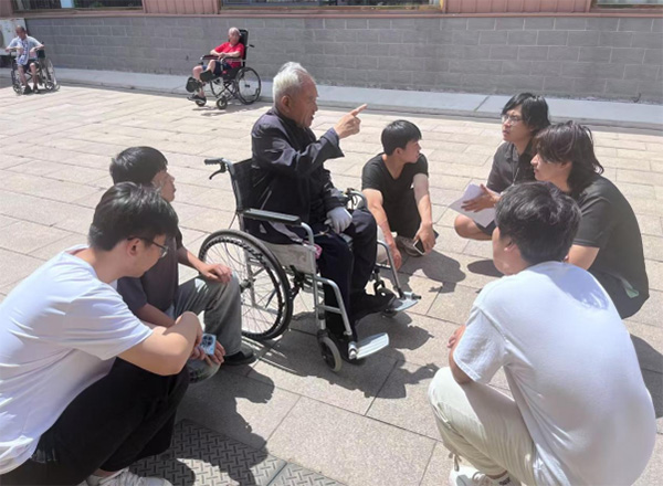 情感交流環節中,幾位成員圍坐在院子里,專心聆聽坐在輪椅上的老人講述過往經歷。老人用手指著遠方,分享記憶中的點滴,而志愿者們則一邊記錄一邊互動交流。這一幕拉近了彼此之間的距離,也讓老人感受到陪伴的溫情。